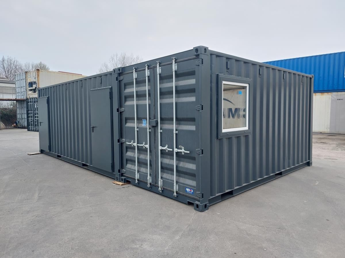 Dieser maßgefertigte Sonderbaucontainer überzeugt durch seine robuste Bauweise und vielseitige Nutzungsmöglichkeiten. Gefertigt aus zwei hochwertigen 20-Fuß-Seecontainern ergänzt durch einen zugeschnittenen 16 Fuß Container, bietet er durch die großflächige Öffnung und stabile Innenverstärkung ein großzügiges Raumkonzept – ideal für Büro-, Aufenthalts- oder Technikräume.